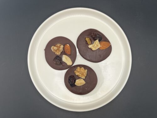 - Leg 60 g studentenhaver op de nog zachte chocolade.
