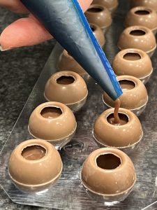 - Verwijder het bovenste deksel van de kogeltruffels en bewaar deze voor later. Laat de kogeltruffels in het plastiek zitten. Vul de truffelvormen met de ganache.